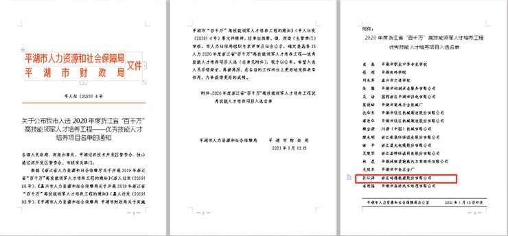 平湖市人社局和財政局于2021年1月13日聯合發文《關于公布我市入選2020年度浙江省“百千萬”高技能領軍人才培養工程——優秀技能人才培養項目名單的通知》【平人社(2021)4號】。希望孫從濤同志珍惜榮譽,再接再厲,更好地發揮表率作用,力爭取得更好的成績。同時號召鴻禧同仁要以此為榜樣,弘揚勞動精神、勞模精神、工匠精神,在公司李健董事長的領導下,在鴻禧能源的二次創業征程中,開新局、謀新篇!
